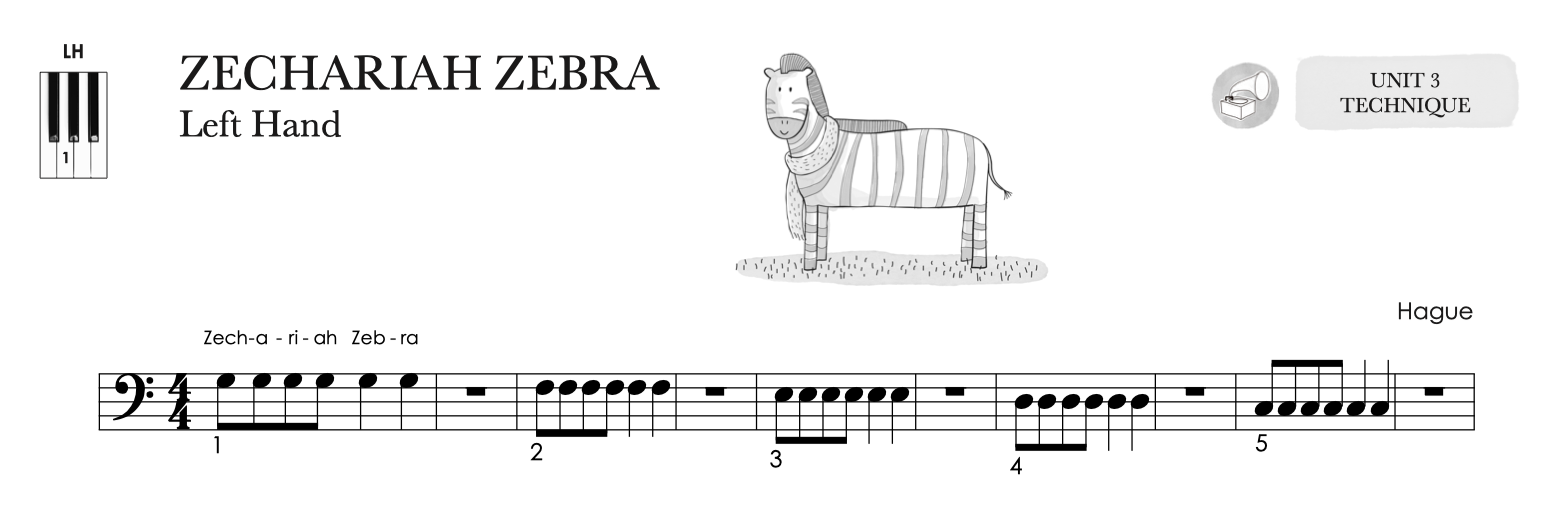 The Zechariah Zebra Technique allows students to develop hand shape and firm the end joints of the fingers by concentrating on playing repeated notes one finger at a time. A whole rest is placed between each finger to allow students to reset the hand shape if it goes awry during the playing of a certain finger. Coordination and strength to play each finger with a correct hand shape takes time to develop. The measure of rest between each finger allows for growth toward this ideal.