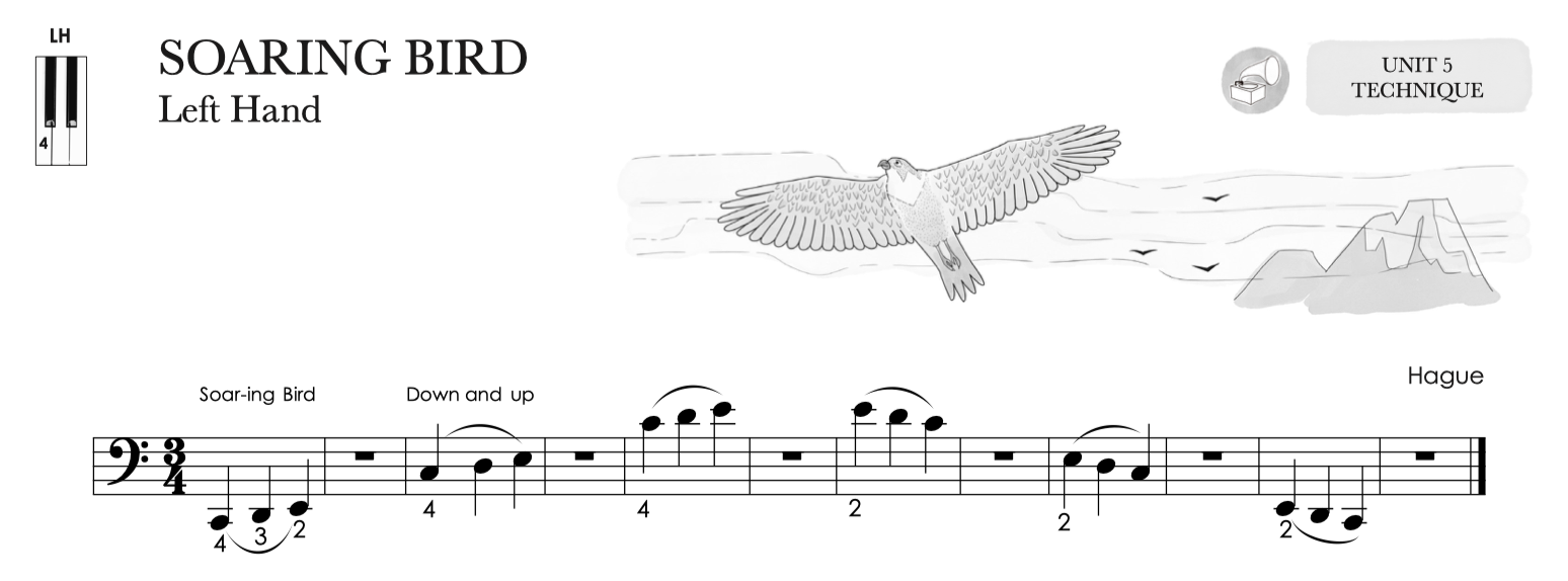 This basic non legato technique is further refined through study of the Tall Giraffe Technique. Along with the non legato articulation, students use a graceful wrist motion to lift off the half note, which we liken to the tall neck of the giraffe.